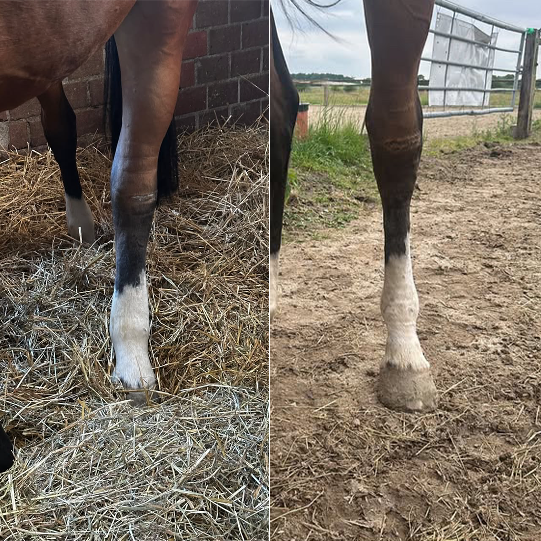 Hey, ich wollte euch mal den Erfolg meiner Springstute vorstellen. Sie hatte letztes Jahr ganz extrem mit Einschüssen und dadurch mit Phlegmonen zu tun. Die Haut ist sogar schon aufgeplatzt… wir dachten, wir würden das Bein nie wieder dünn bekommen. Eure Bandagen haben sie gerettet. Seitdem hat sie die immer an, außer beim Reiten und beim Transport. Seit einem Jahr mega Glück damit.