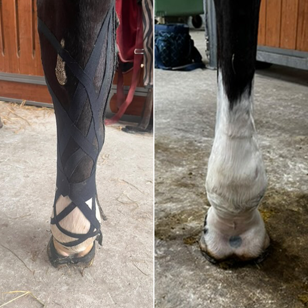 Equicrown active, kein „Produkt“ hat uns in den letzten Monaten diesen Erfolg gebracht wie dieses. Meine Stute leidet seit Juli 2020 an einem medialen Fesselträgerschenkelschaden. Nichts half ihr bei der Umfangsverminderung so sehr wie diese Bandagen und man muss erwähnen das rechte Bild entstand in der Eingewöhnungsphase nach der 4 Stunden Tragezeit.