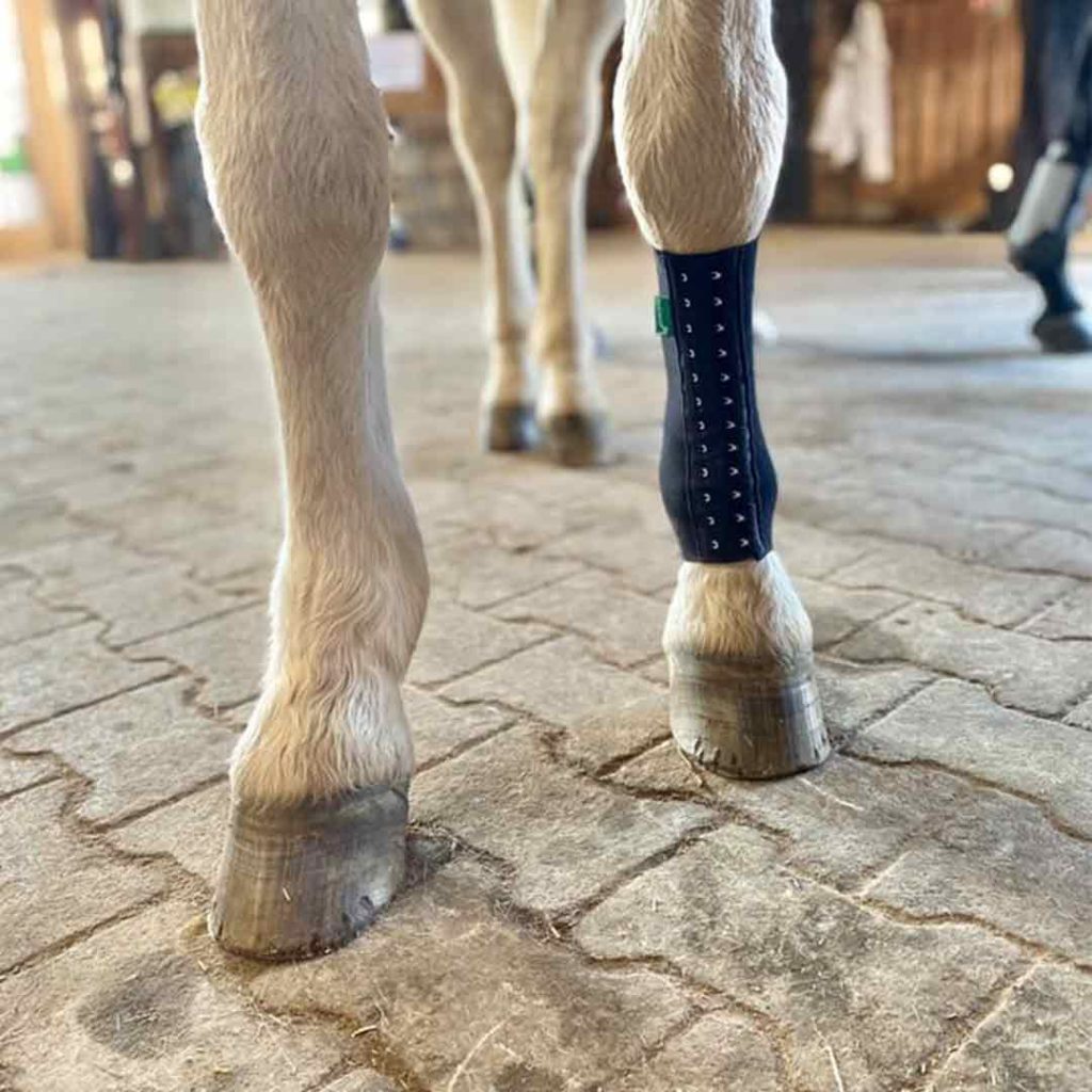 Im Februar 2020 hat sich mein Sportpartner Milan das Griffelbein gebrochen, nach der Operation hatten wir mit starken postoperativen Schwellungen zu kämpfen. Gerade in dem Bereich um die Narbe herum war das Gewebe schwach und anfänglich nicht dazu in der Lage angestaute Flüssigkeiten abzutransportieren. Nach Absprache mit unseren Tierärzten haben wir uns für eine Behandlung mit den Kompressionsbandagen von EquiCrown (auch bekannt als Stützstrümpfe für Pferde) entschieden. Sechs Monate nach dem Bruch ist Milans Bein wieder so definiert wie vorher und wir haben keine Probleme mehr mit angestauter Flüssigkeit.